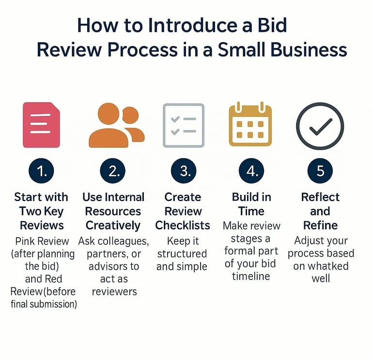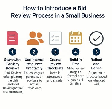 Introducing colour team reviews doesn’t require a large team or complex systems. Here’s a simple action plan for small businesses to start building a scalable, quality-focused review process: