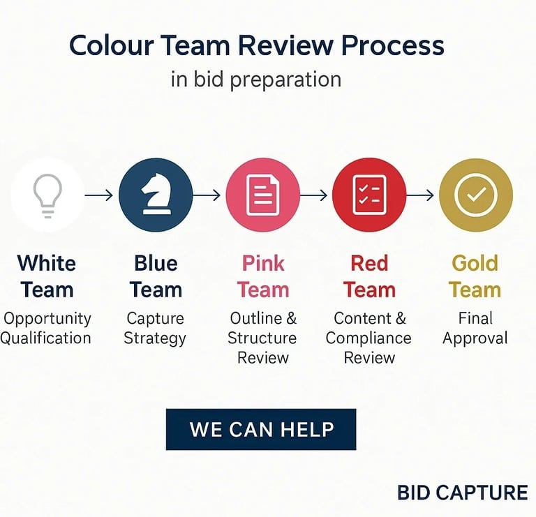 Colour team reviews are a staged quality assurance process used by successful bidding organisations to strengthen proposals at each phase of development. Each colour represents a different checkpoint, with a specific focus designed to enhance the quality, alignment, and impact of your bid. Far from being just a formality, these reviews allow teams to refine strategy, improve persuasiveness, ensure compliance, and catch errors before submission.